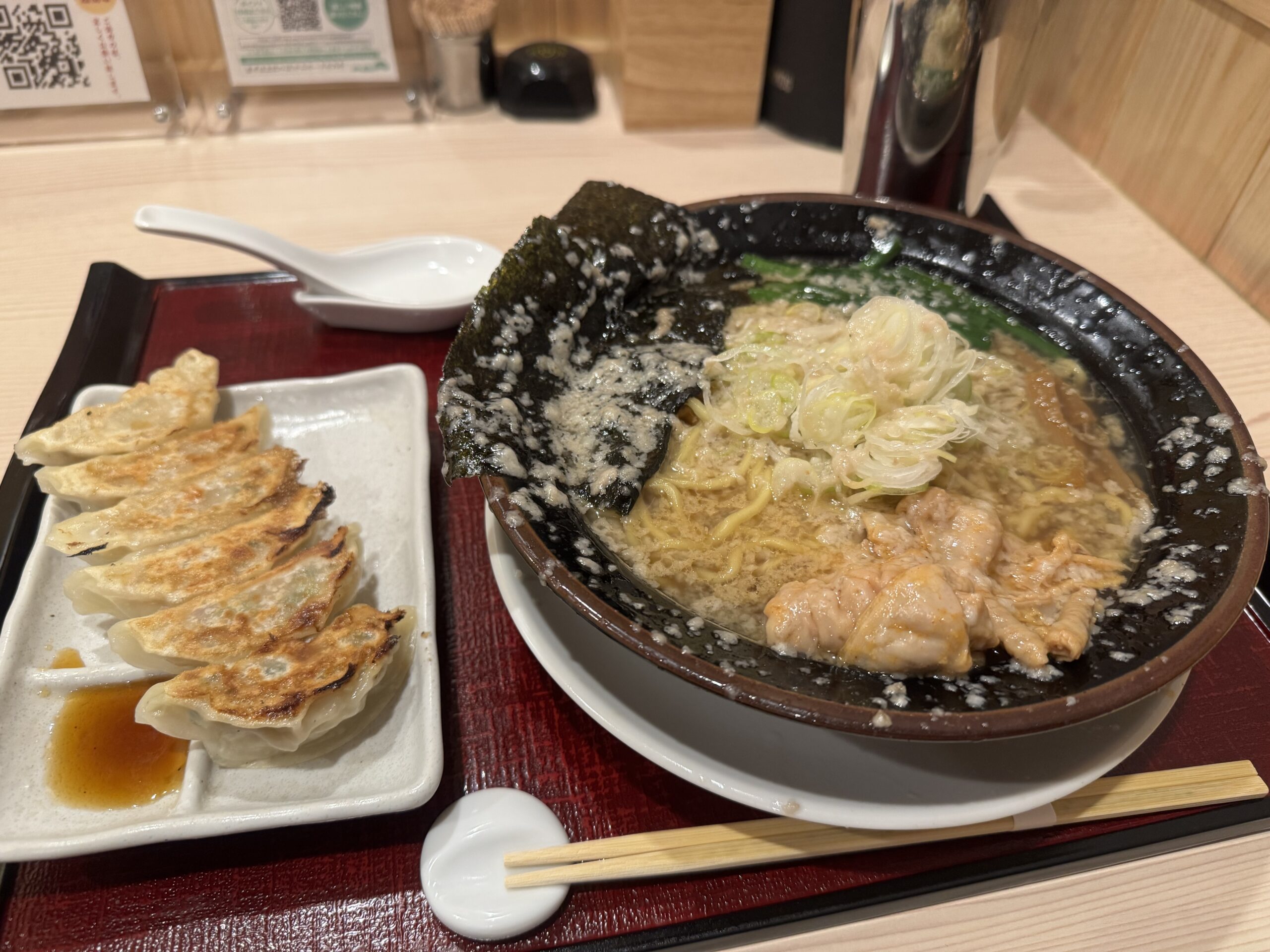 ホルモンが添えられた醤油ベースの濃厚背脂ラーメン。さすがに腹パンパンになり、今日は終了です(>人<)