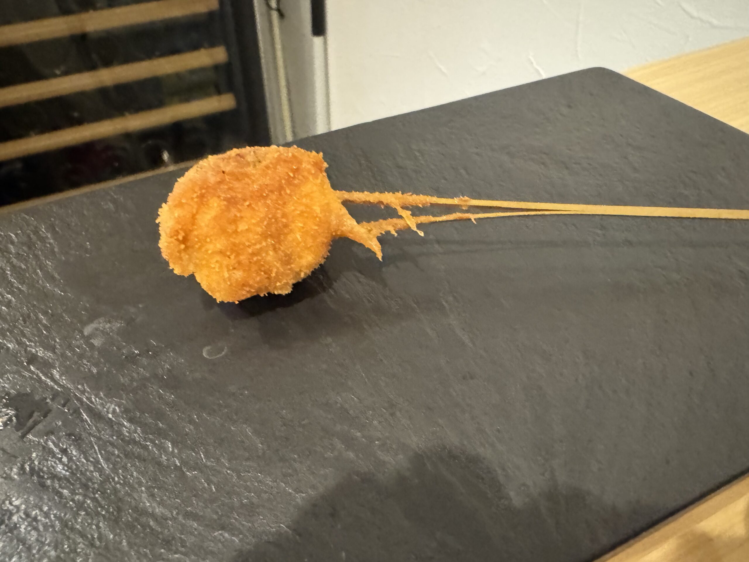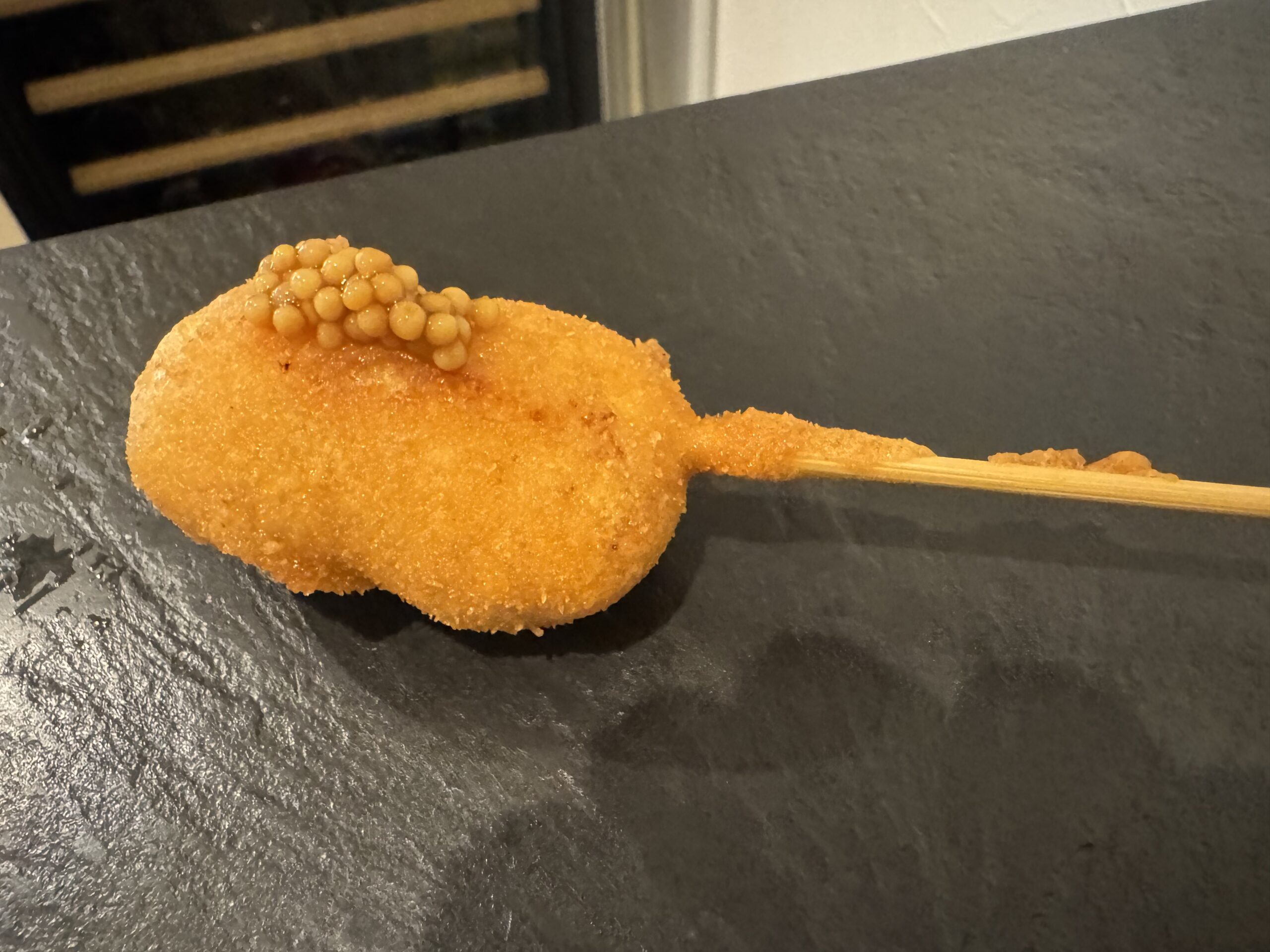 今日の晩御飯は以前にもお伺いした『串揚げタケナカ』。お洒落な串揚げ(トリュフクリームグラタンや鮑など)にワインがよく合いました☆
